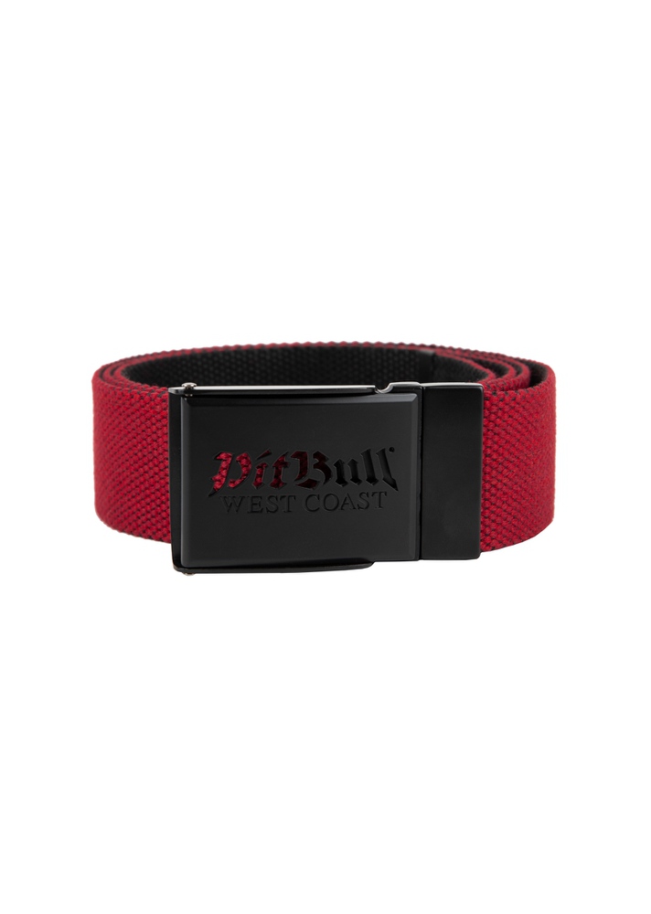 Pasek parciany z najnowszej kolekcji marki Pit Bull. Wykonany z solidnych i mocnych materiałów. Metalowa klamra posiada wycięty napis prezentujący producenta markę Pit Bull West Coast. Produkt o dwustronnej konstrukcji, w której swobodnie można przekładać klamrę. Długość całkowita 120cm, szerokość 4 cm. Kolory czerwony i czarny.